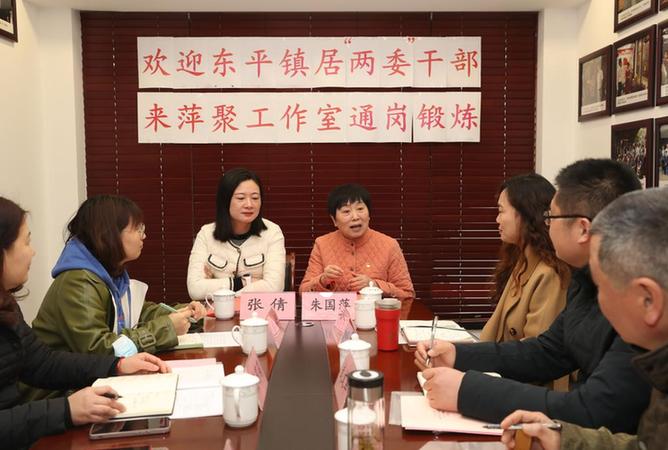 2023年2月21日,在萍聚工作室,朱国萍与来自崇明区东平镇的社区干部们交流。新华社记者刘颖摄